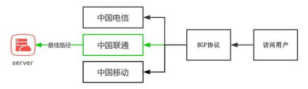 bgp是运行于 TCP 上的一种边界网关协议,通俗来讲,中国电信 、中国联通、中国移动和一些拥有AS自治域的大型民营IDC运营商就可以通过BGP协议来实现多线互联。举个例子: